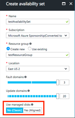 When creating the Availability Set, make sure to select No (Classic) for the Use managed disks option. No is the default option.
