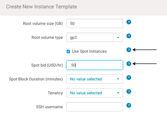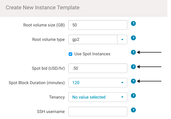 To configure an instance template for Spot block instances, check the Use Spot Instances checkbox, enter a value in the Spot bid field, and choose a value from one to six hours (in intervals of 60 minutes) in the Spot Block Duration dropdown.