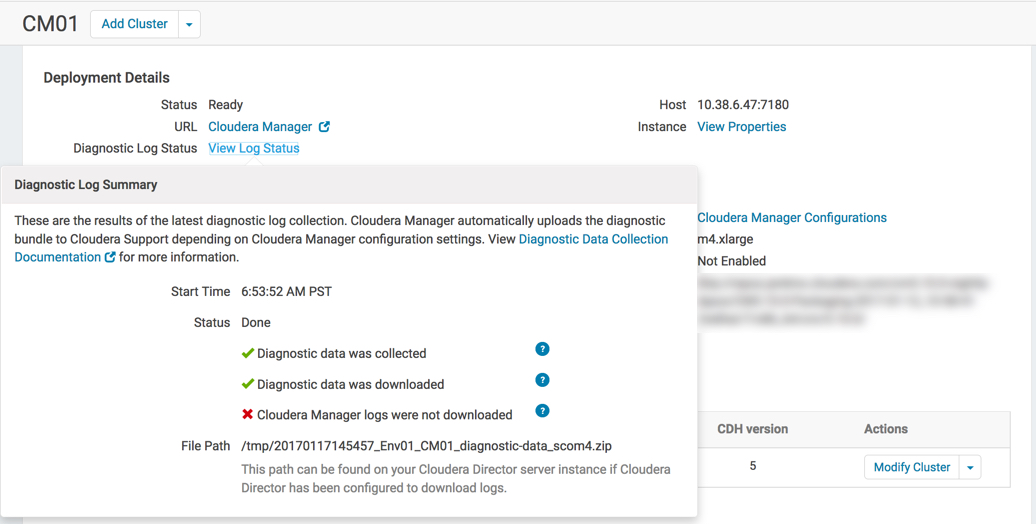 Cloudera Manager log files provide important information for Cloudera Support to use in analyzing problems or unexpected behavior with Cloudera Manager deployments or CDH clusters. Altus Director triggers the collection of diagnostic data for deployments and clusters it manages. This helps prevent situations where a failed cluster has been terminated but Cloudera Support has no diagnostic data or log files to help identify the cause of the failure. If you have a Cloudera Enterprise or Cloudera Enterprise Trial license, diagnostic data is collected and sent to Cloudera Support automatically on cluster bootstrap or update failure. By default, diagnostic data is also downloaded to the Altus Director instance.