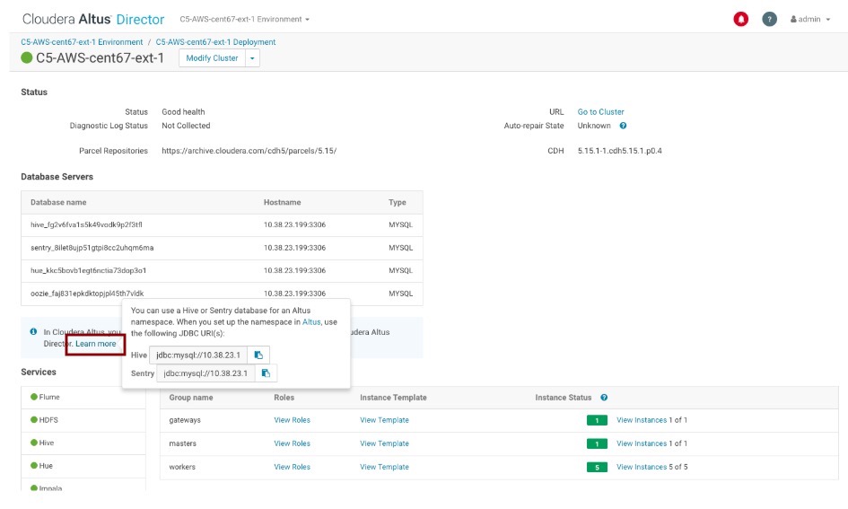 You can find the database URI on the Altus Director web UI. The Cluster Details page displays the database servers that are configured for the cluster with a note about setting up SDX namespaces in Altus services. Click the Learn More link in the note to display the JDBC URLs for the Hive metastore and Sentry databases.