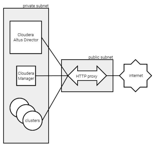The diagram below shows one possible architecture where proxy use is necessary for Altus Director, Cloudera Manager, and clusters to reach the internet. In this case, all of the components run in a private subnet without internet access, but with the ability to reach a single proxy running in a separate, accessible public subnet.
