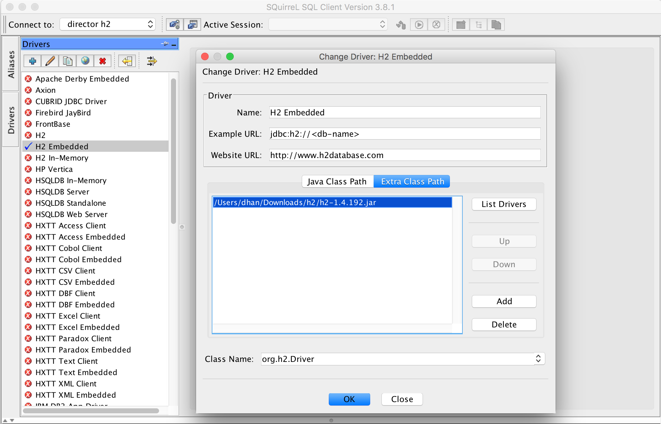 - Edit the H2 Embedded driver, adding the downloaded jar file to the Extra Class Path.