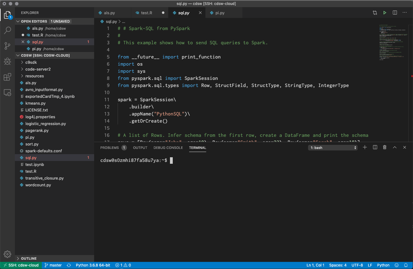 Using the Explorer view, you remotely edit and modify your Cloudera Machine Learning files. VS Code also supports Python and R which
