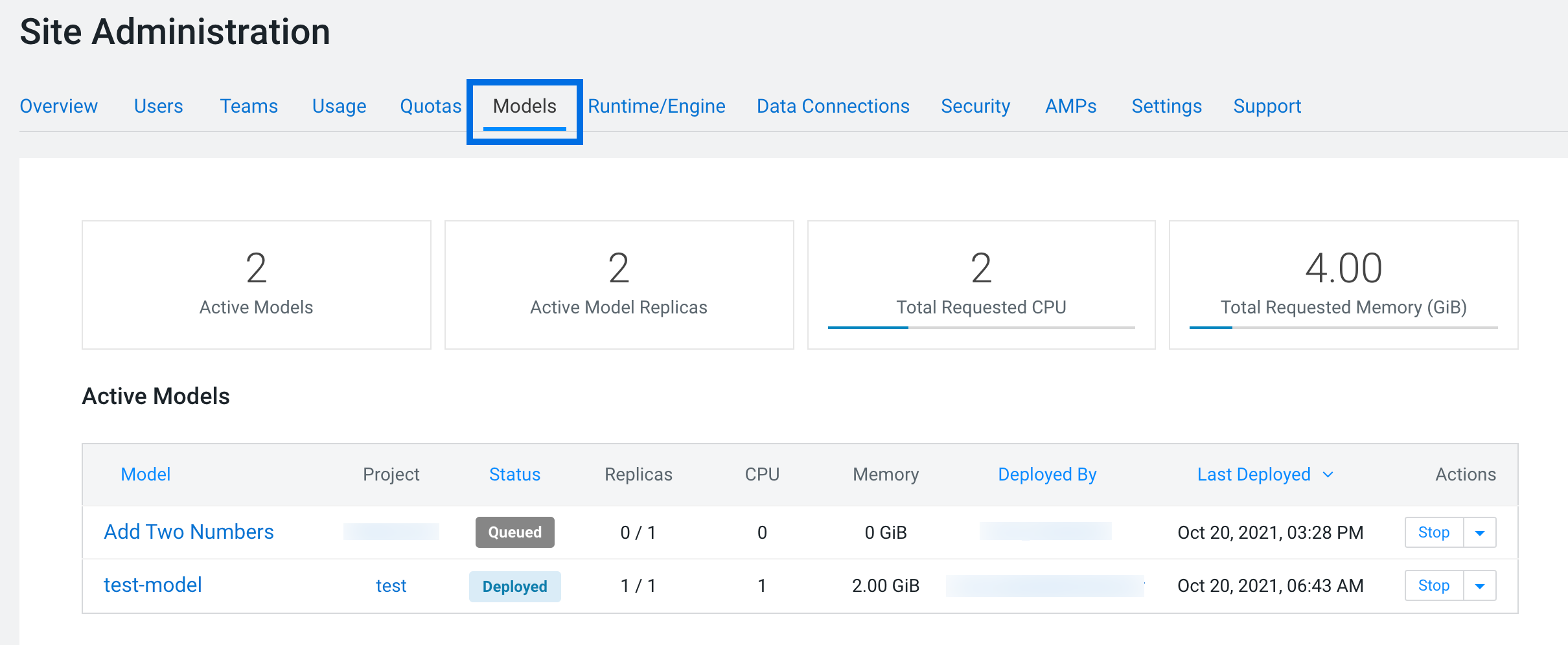 To see a complete list of all the models that have been deployed on a deployment, and review resource usage across the deployment by models alone, go to . On this page, site administrators can also Stop/Restart/Rebuild any of the currently deployed models.