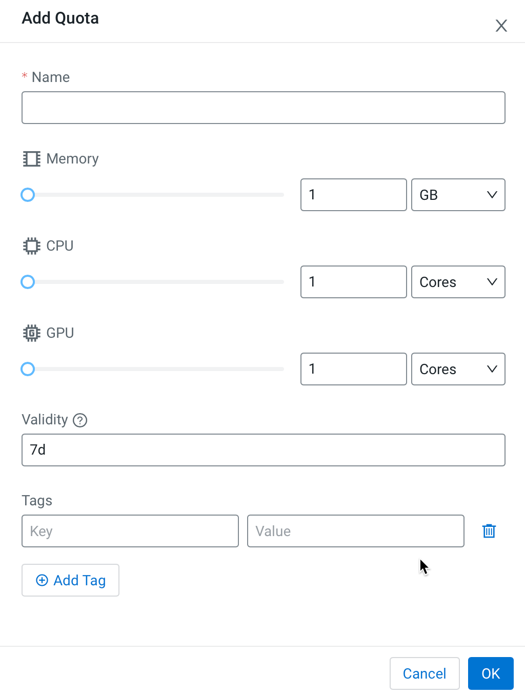 - CPU – Use the sliders to select the CPU allocation for the pool. You can choose how CPUs are counted by selecting Cores or Millicores from the drop-down list.