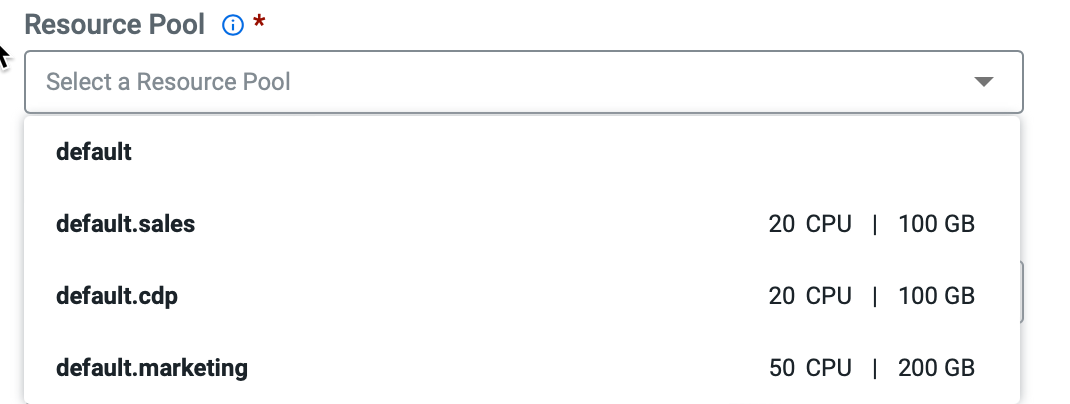 When you click on the drop-down list for Resource Pool, a list of available pools, as defined on the Quotas page, displays.