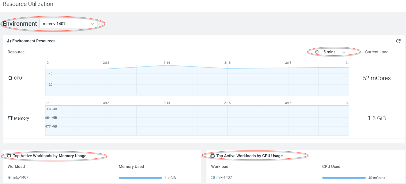 You can select a time range from the available options, between five minutes and 15 days, and view resource utilization data of a specific environment.