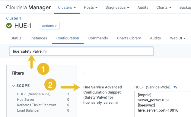 1. In the Cloudera Manager Admin Console, select Clusters > Hue > Configuration to navigate to the configuration page for Hue.