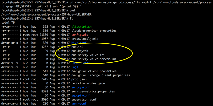 ls -ltr /var/run/cloudera-scm-agent/process/`ls -valrt /var/run/cloudera-scm-agent/process | grep HUE_SERVER | tail -1 | awk '{print $9}'`