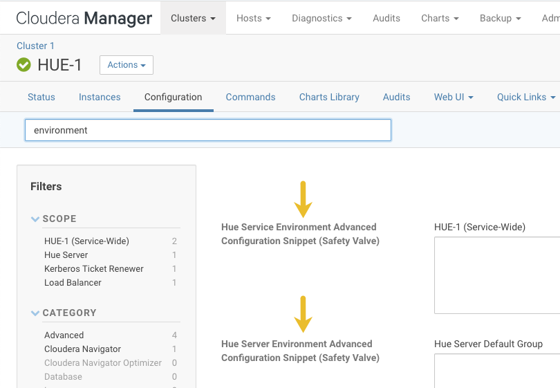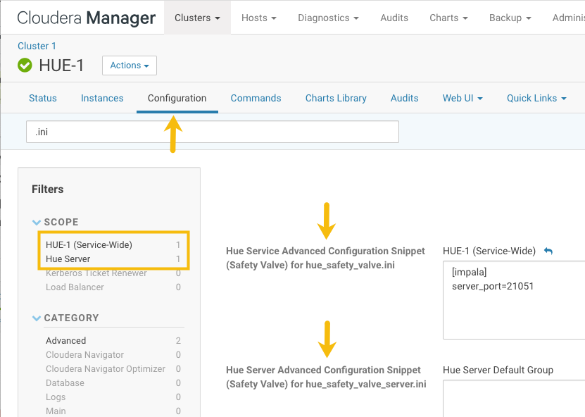 In Cloudera Manager, all Hue properties and safety-valves can be found on the tab,