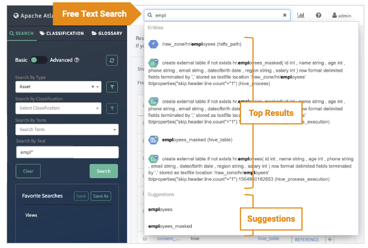 Apache Atlas builds a ranked index of metadata values so you can search for values across all metadata.