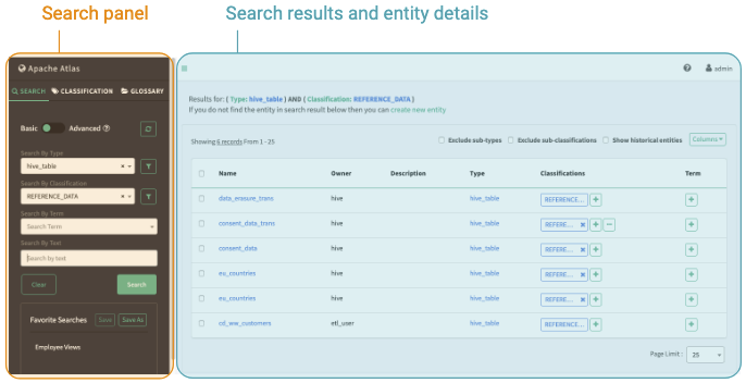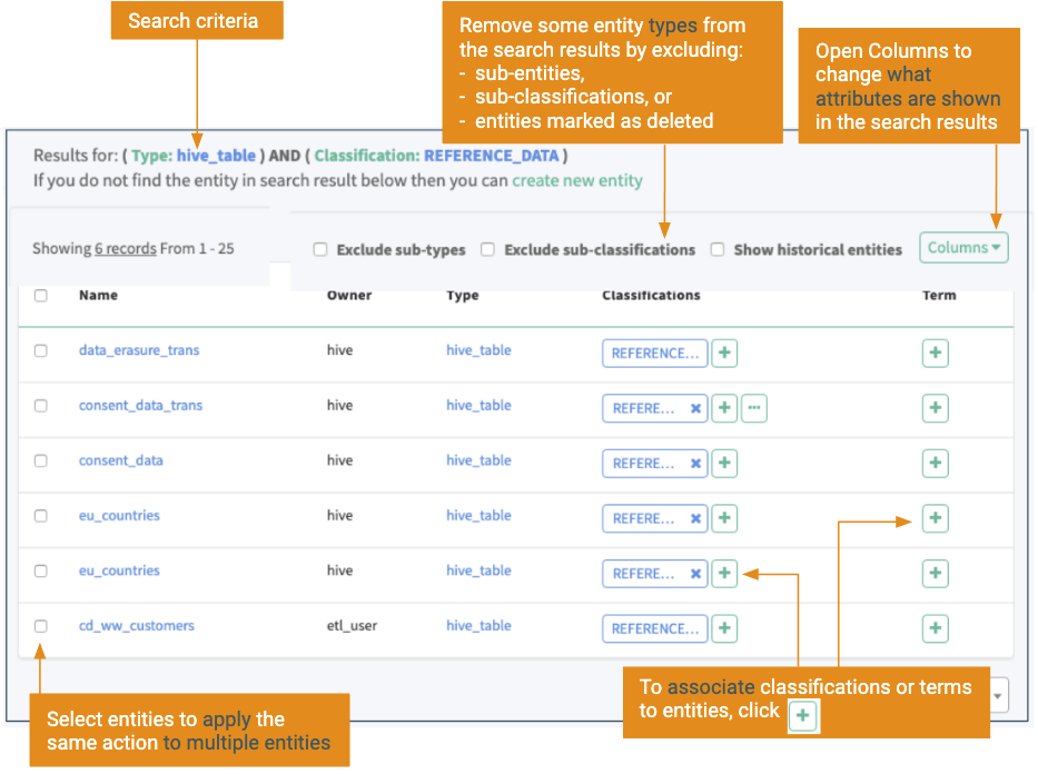 When you run a search and Atlas returns results, you see a paged-list of entities that match the search criteria. From here, you can go back to the search options and further refine your search or use controls to change how the search results are presented.