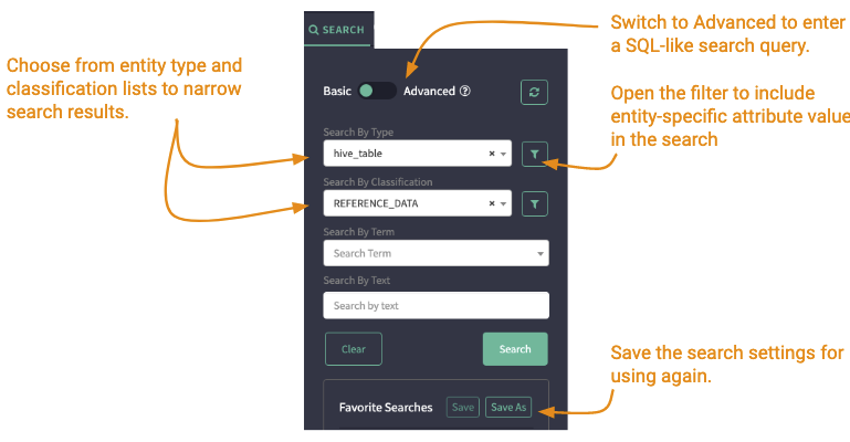 The search panel has three tabs for searching: the general Search tab, and predefined searches based on Classifications and Glossary terms. In the general Search tab, you choose from existing lists of metadata types to narrow the search results. Switching to the Advanced search lets you enter specific search queries; both basic and advanced searches can be saved for easy reuse.
