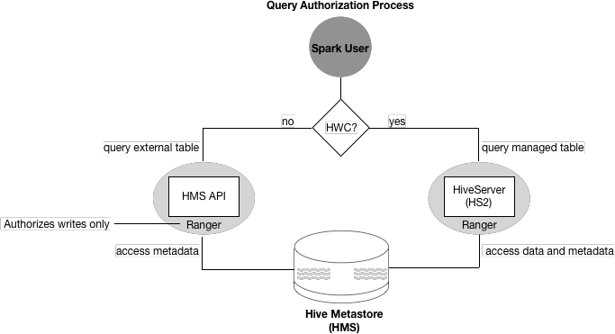 To read or write external tables from Spark, can use the HWC, or not, based on your use case. The Spark job accesses the metadata first, and then indirectly (no HWC), or directly (through HWC) accesses the data. Of course, file system permissions must be set to allow Spark direct access to the data.