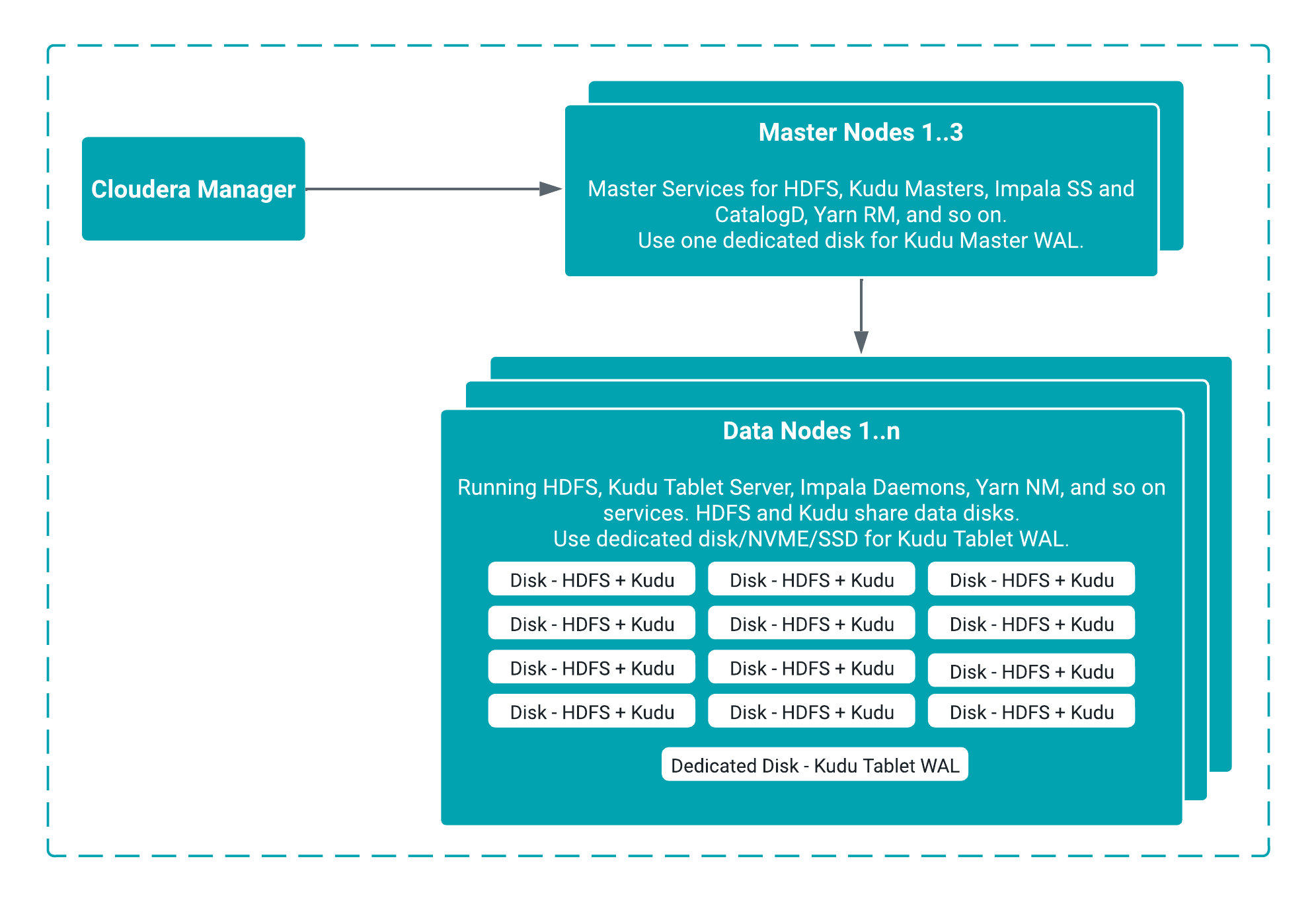 The base cluster is managed through Cloudera Manager. Kudu shares master and data nodes on the