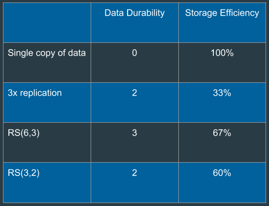 The following image compares the data durability and storage efficiency of different RS codecs and replication: