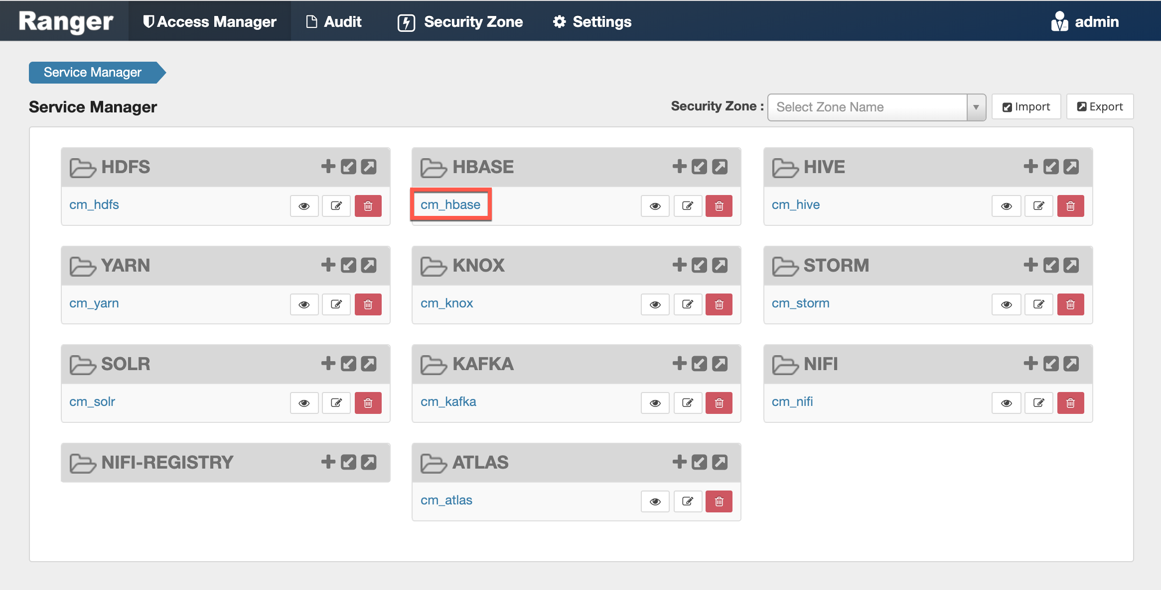 The preloaded resource-based services appear on the Service Manager page for resource-based policies, and are prefixed with "cm_".