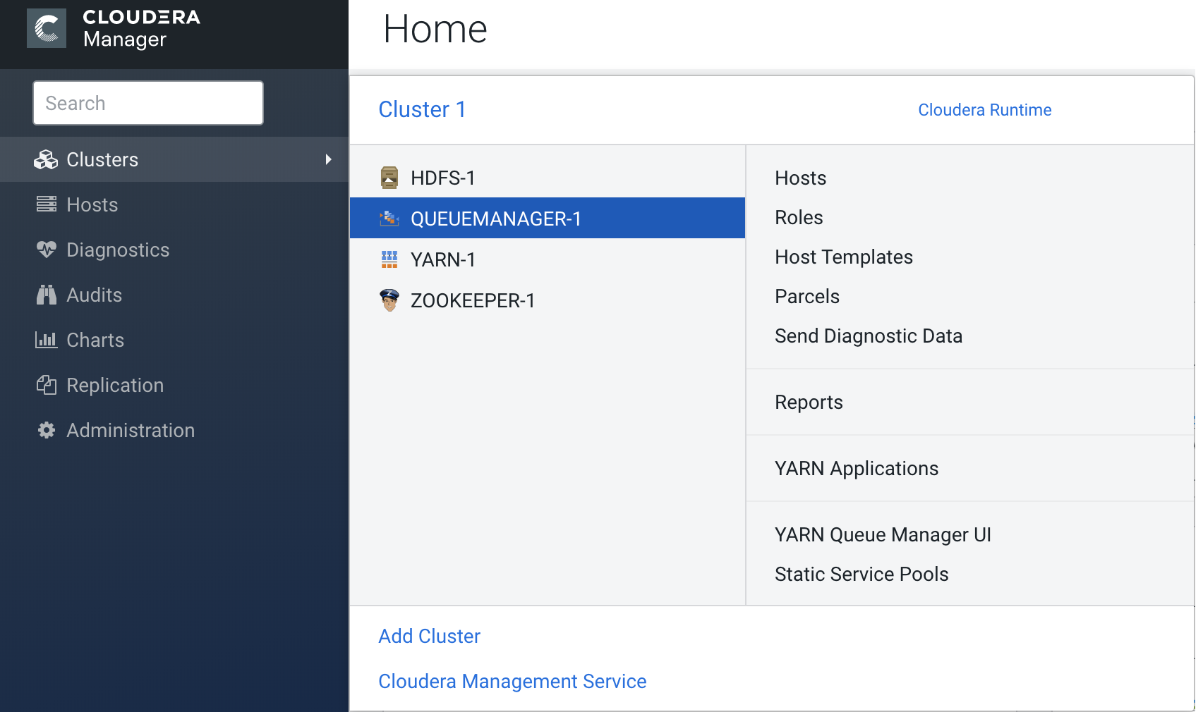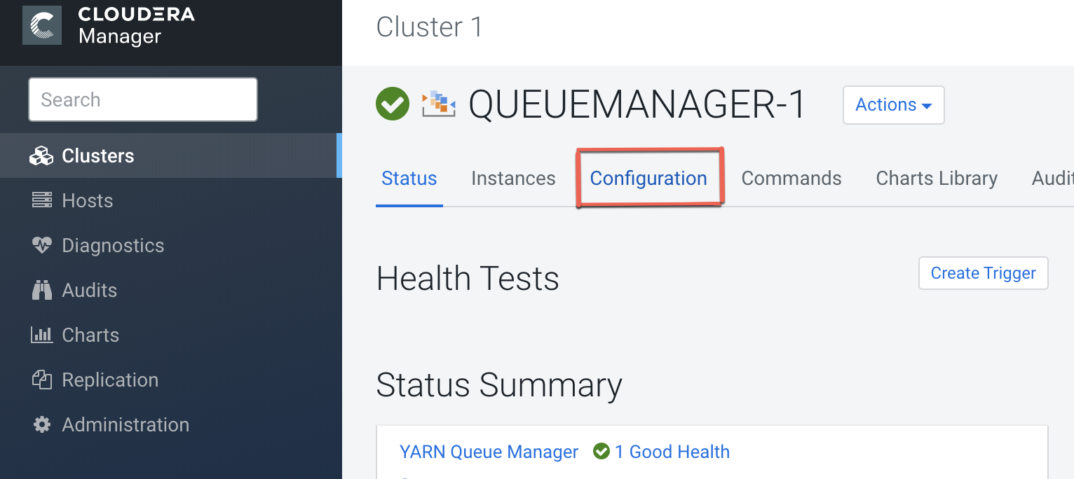 - In Cloudera Manager, select Clusters > QUEUEMANAGER-1 service.