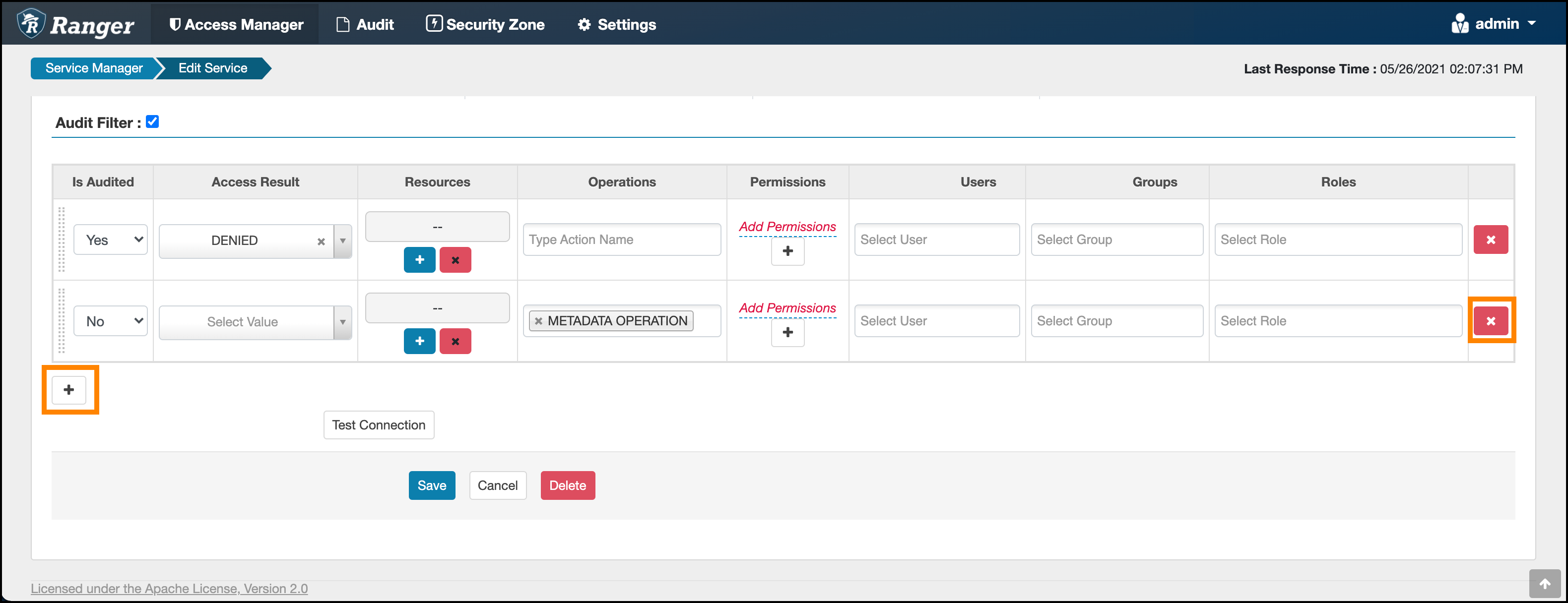 each audit filter row for the service. The preceding example shows the Add and Delete