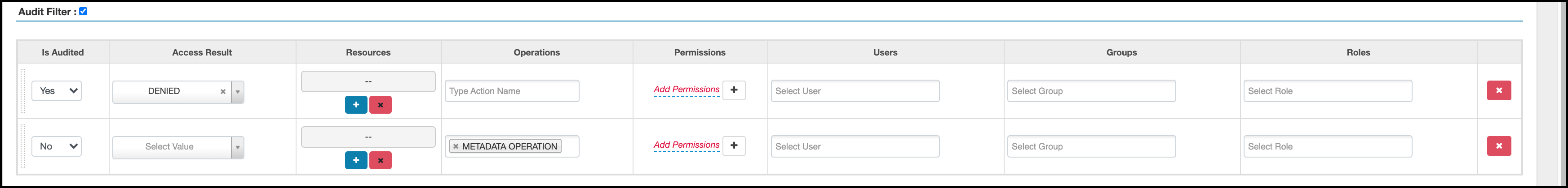 denied" to appear in audit logs. The lower row defines a filter that causes no metadata