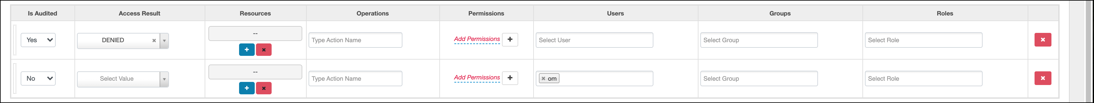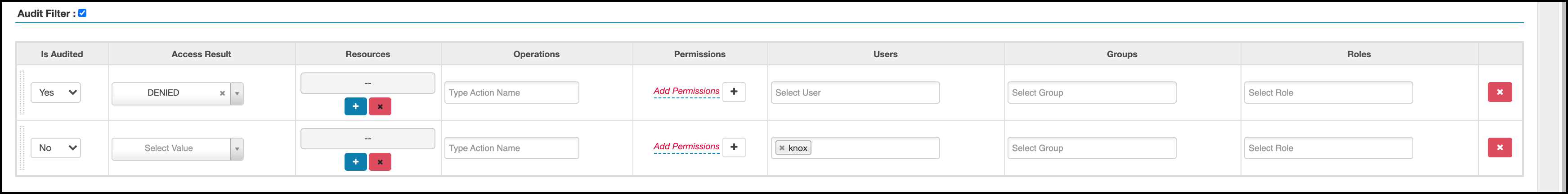 this example, the top row defines an audit filter that causes all instances of "access