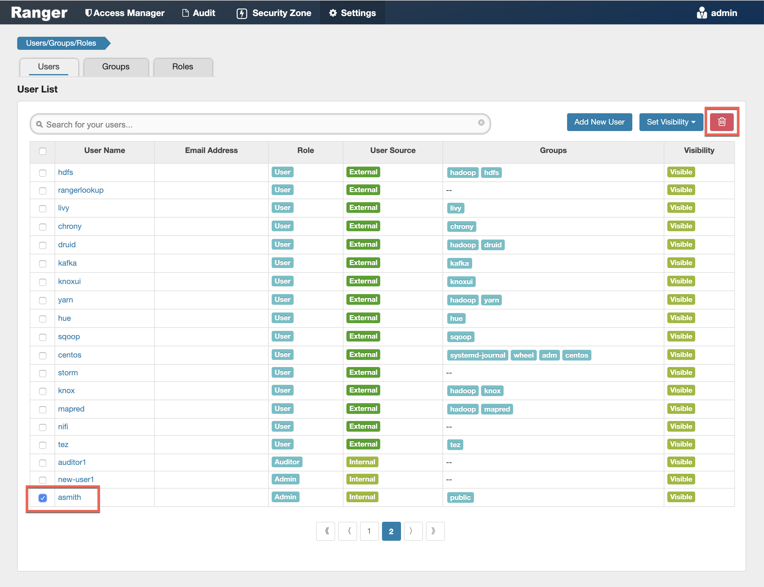 To delete a user, select the check box for the user in the User Name list, then click the red Delete button. Ranger removes the user from all policies.