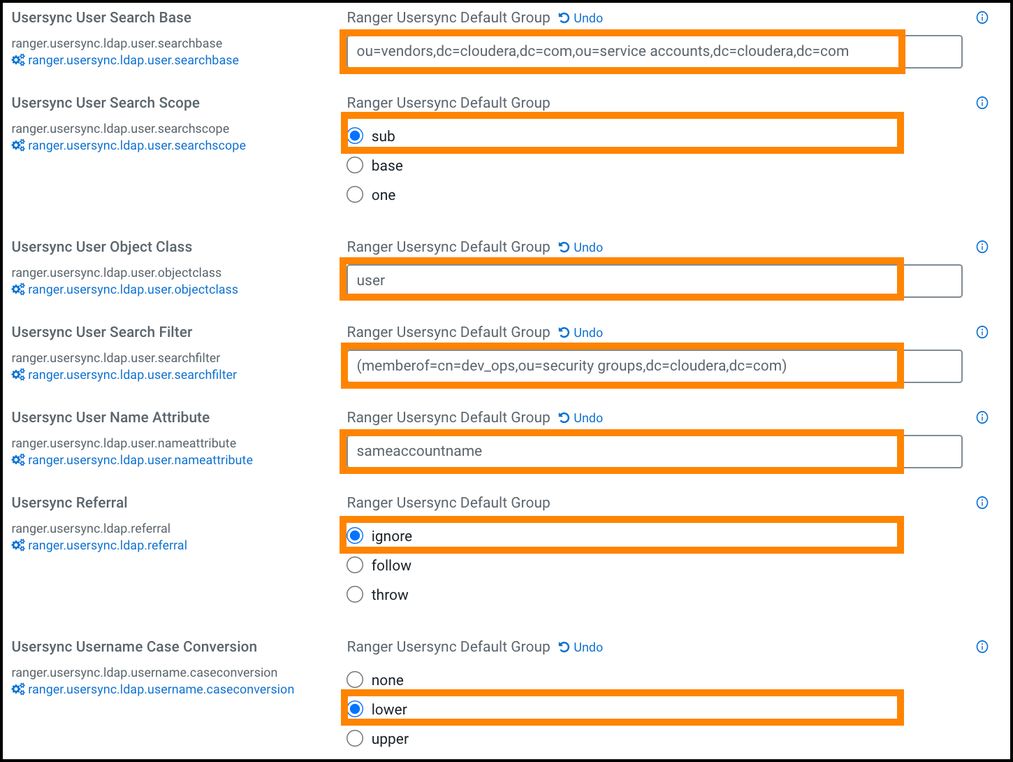 - ranger.usersync.ldap.user.searchfilter - In this example, since the customer wants to sync only the users that belong to dev_ops, the value for this property is (memberof=cn=dev_ops,ou=security groups,dc=cloudera,dc=com) .