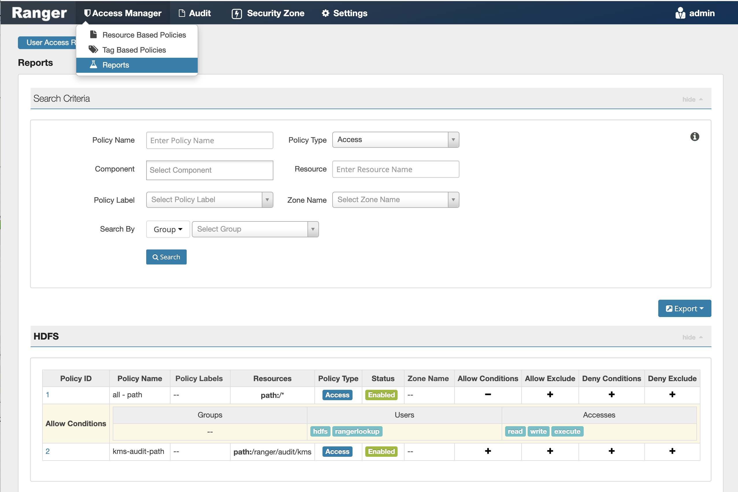 You can use the Reports page to help manage policies more efficiently as the number of policies increases. This page lists all resource-based and tag-based policies.