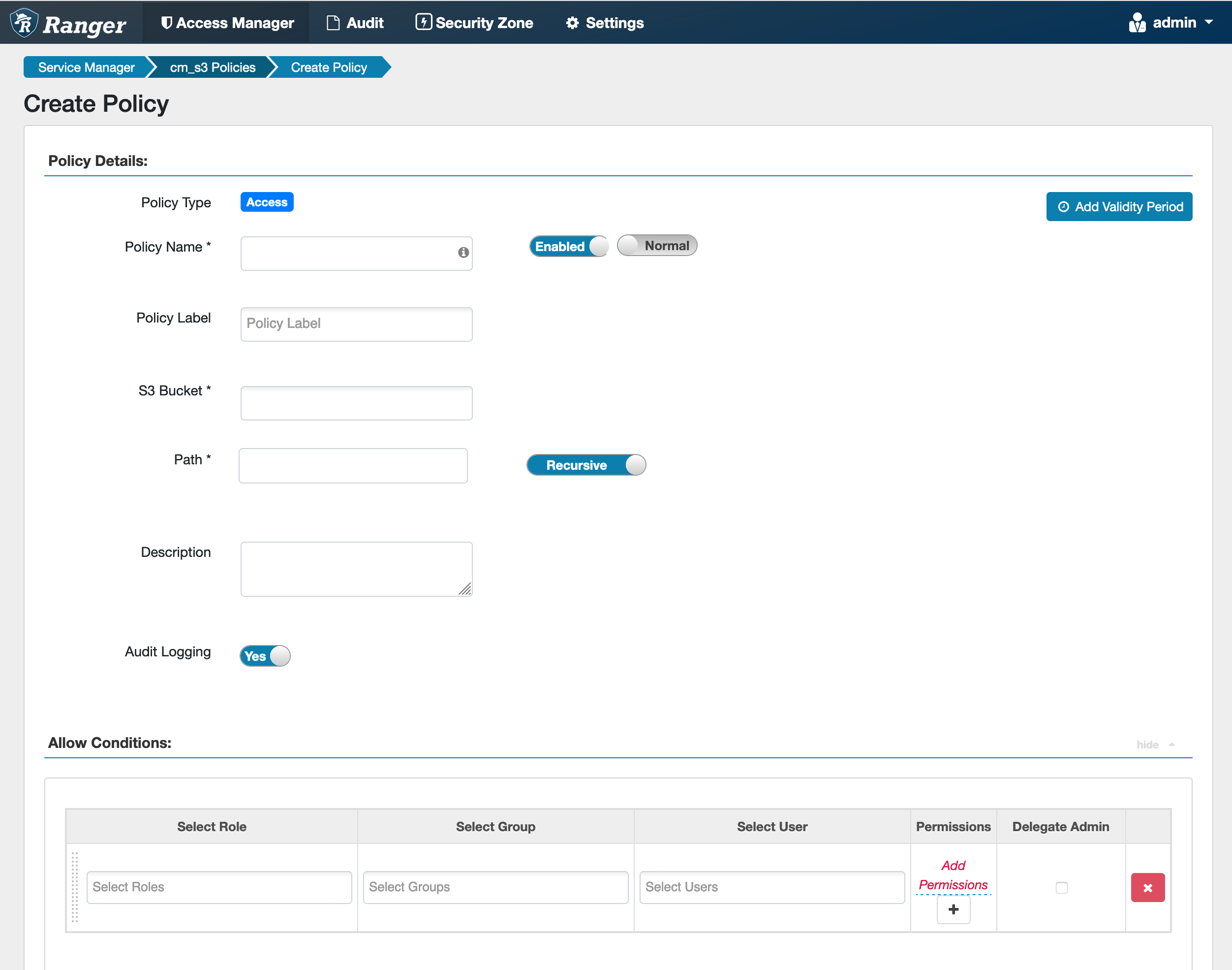 Table 1. Policy Details Field Description Policy Name Enter a unique name for this policy. The name cannot be duplicated anywhere in the system. Policy Label An optional label for the policy. You can search reports and filter policies based on these labels. Enabled/Disabled Enables or disables the policy. Normal/Override Enables you to specify an override policy. When override is selected, the access permissions in the policy override the access permissions in existing policies. This feature can be used with Add Validity Period to create temporary access policies that override existing policies. S3 Bucket The S3 bucket. Path Specify the path for the policy. The default Recursive setting specifies that the path is recursive; you can also specify a non-recursive path. Description (Optional) Describe the purpose of the policy. Audit Logging Specify whether this policy is audited. (De-select to disable auditing). Add Validity Period Specify a start and end time for the policy. Table 2. Allow Conditions Label