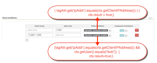 • Deny one particular user, “bob” from a group, “users”, only when this user is accessing resources from a particular IP defined as an tag attribute in Atlas.