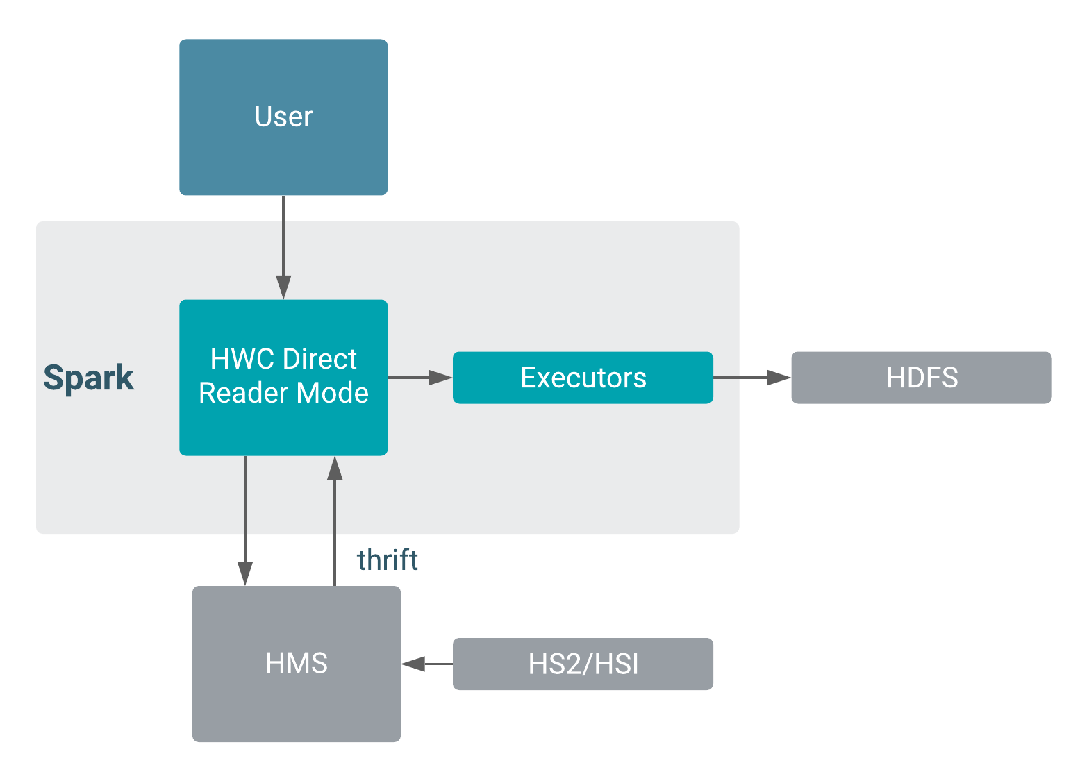 Direct Reader mode is a transparent connection that Hive Warehouse Connector (HWC) makes to Apache Hive metastore (HMS) to get transaction information. In Direct Reader mode, Spark reads the data directly from the managed table location using the transaction snapshot. You use this mode if you do not need production-level Ranger authorization. Direct Reader mode does not support Ranger authorization.