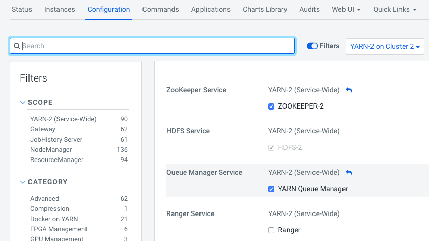 If you add the YARN Queue Manager service to the cluster after installing the cluster, you must configure the YARN Queue Manager dependency in the Yarn Configuration tab.