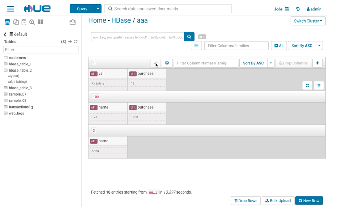 The HBase Hue app enables you to insert a new row or bulk upload CSV files, TSV files, and type