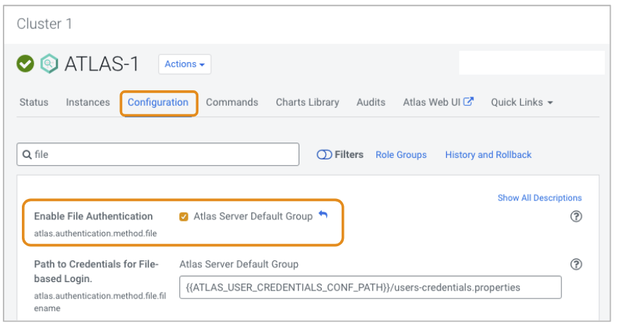users-credentials.propertiesby setting theatlas.authentication.method.file.filenameproperty in the Atlas Server Advanced Configuration Snippet (Safety Valve) for conf/atlas-application.properties. You can find the hostname where the Atlas service is running on the Instances tab in Cloudera Manager. - Configure the list of users as described in step 6 in To add to the users list:.