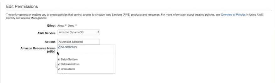 Table 1. Step Considerations Effect Allow AWS Service Amazon DynamoDB Actions All Actions Amazon Resource Name (ARN) * Your configuration should look similar to: