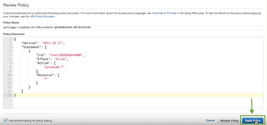 To do this, you must add a DynamoDB access policy to your IAM role using the following steps: