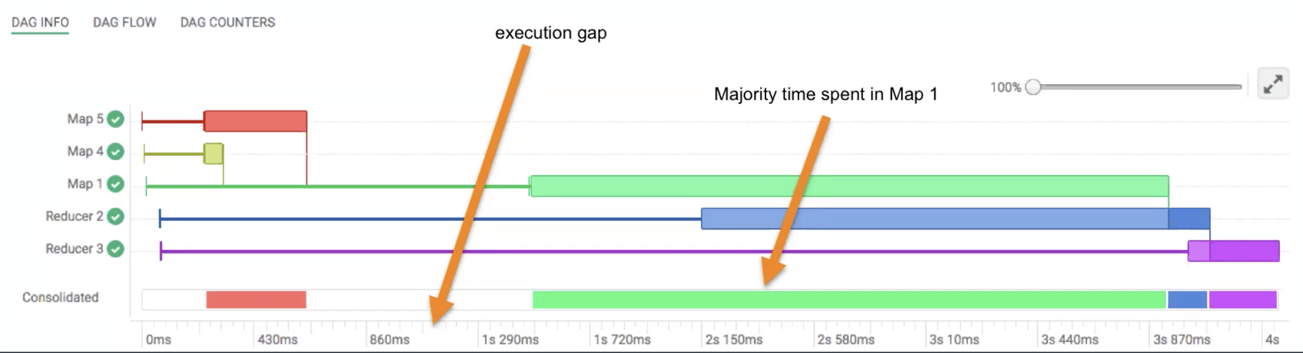 For example, in the following image, Map 1 consumes maximum time. Reducer 2 waits for an input from Map 1, and Reducer 3 depends on Reducer 2 for input: