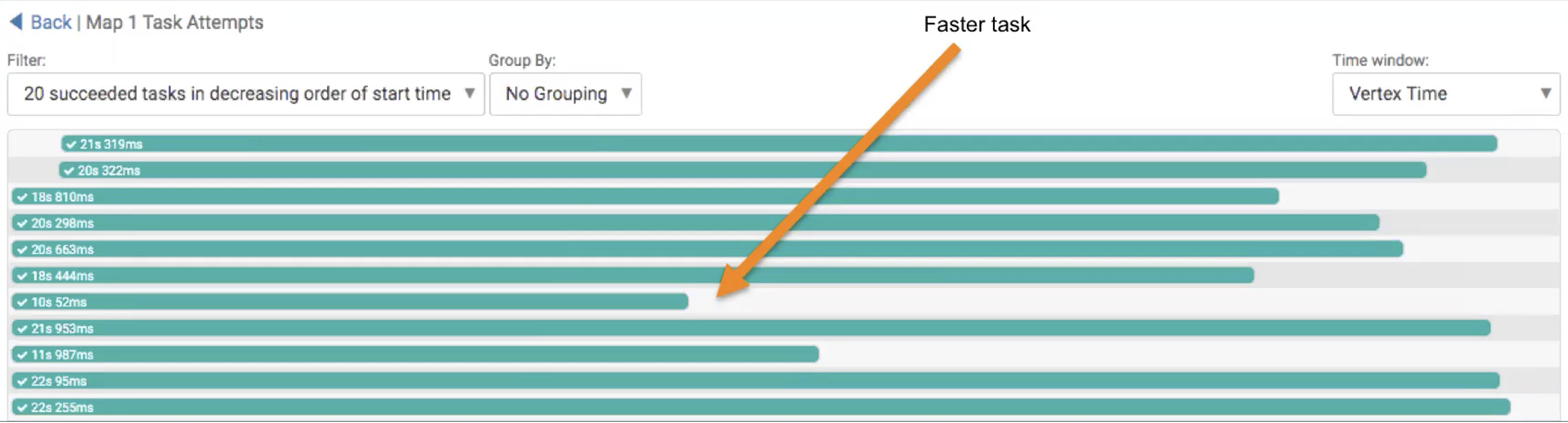 The vertical lines connecting two vertices denote the dependency of one vertex on another. The lightly shaded part of the horizontal bar indicates that a vertex is waiting for an input from the other vertex. The darker part of the bar indicates the actual execution time for that task. The vertical lines indicate the time when the vertex initialized, the time when the vertex started, the time when the first task started, the time when the last task completed, and the time when the vertex finished its execution. When you hover your mouse over the vertical line, the bubble displays the stage of the vertex execution and provides a timestamp.