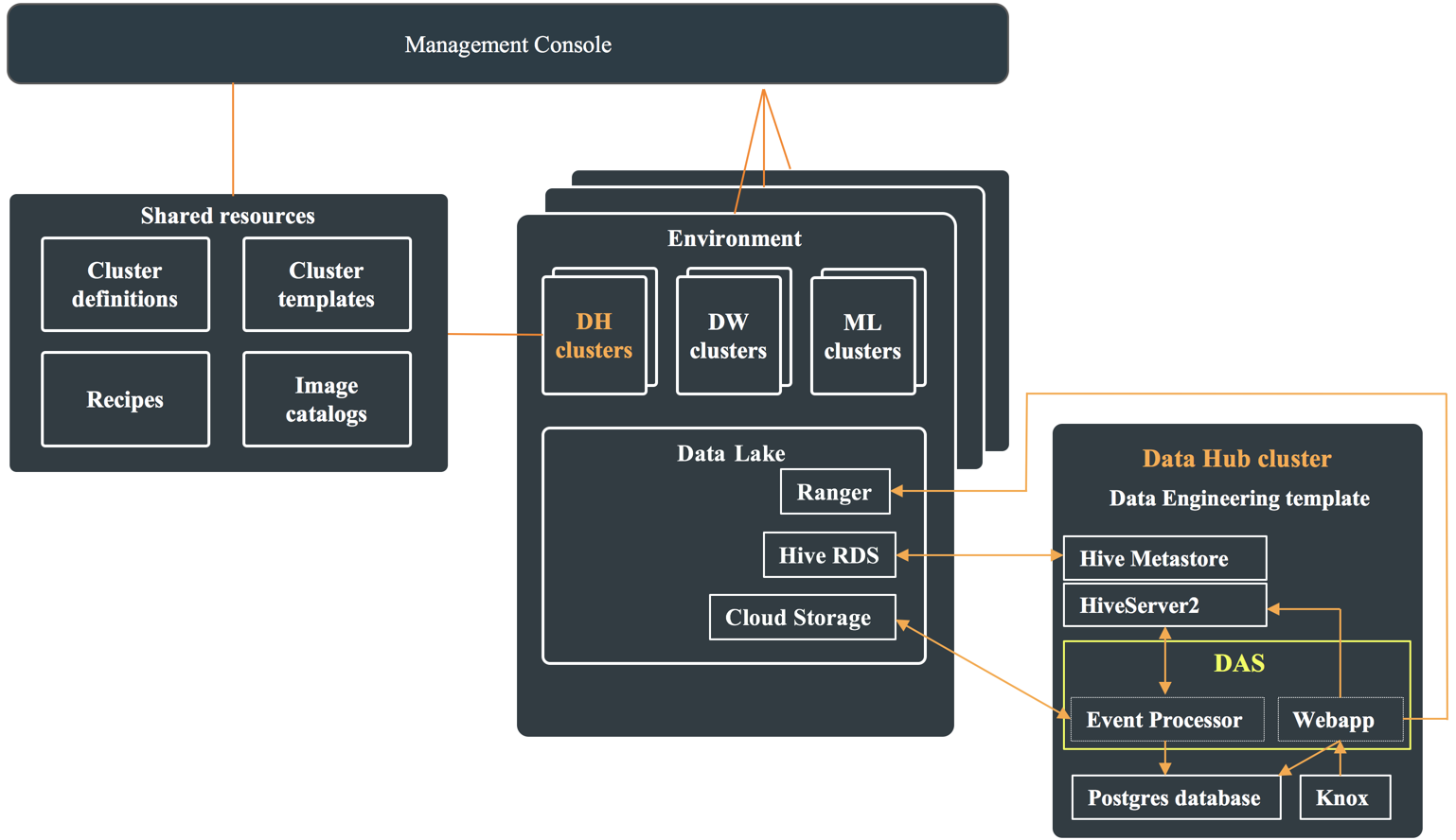 In a CDP public cloud deployment, DAS is available as one of the many Cloudera Runtime services within the Data Engineering template. To use DAS, create a Data Hub cluster from the Management Console, and select the Data Engineering template from the Cluster Definition dropdown menu.