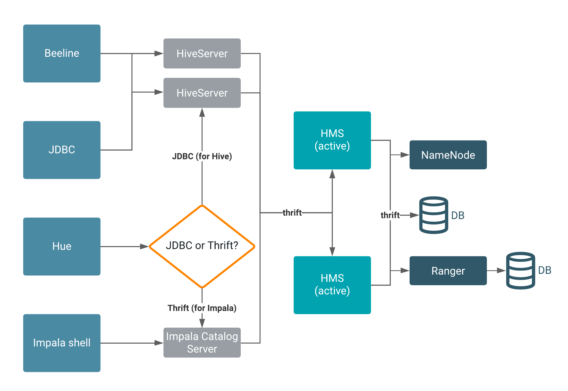 Beeline, Hue, JDBC, and Impala shell clients make requests through thrift or JDBC to