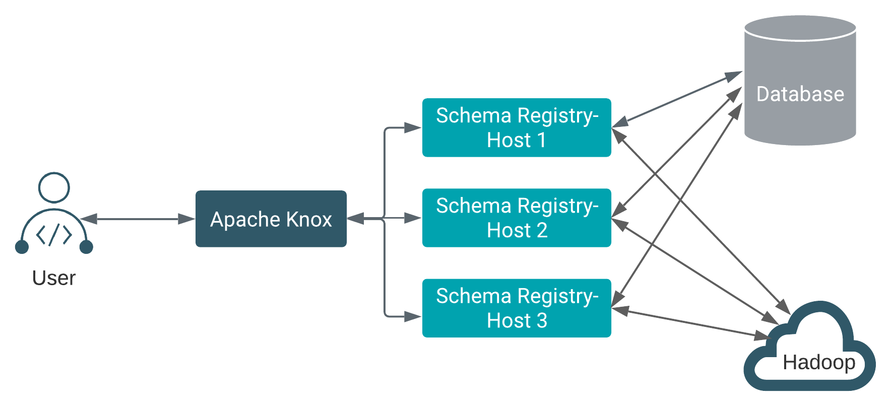 To make Schema Registry highly available in this setup, include a load balancer on top of the services. Clients will communicate through the load balancer. The load balancer will then determine which host to send the requests to. If one host is down, the request is sent to another host. In CDP, the load balancer is Apache Knox.