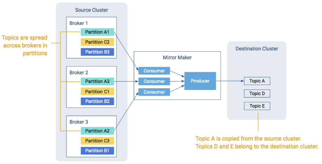 While the diagram shows copying to one topic, Mirror Maker’s main mode of operation is running continuously, copying one or more topics from the source cluster to the destination cluster.