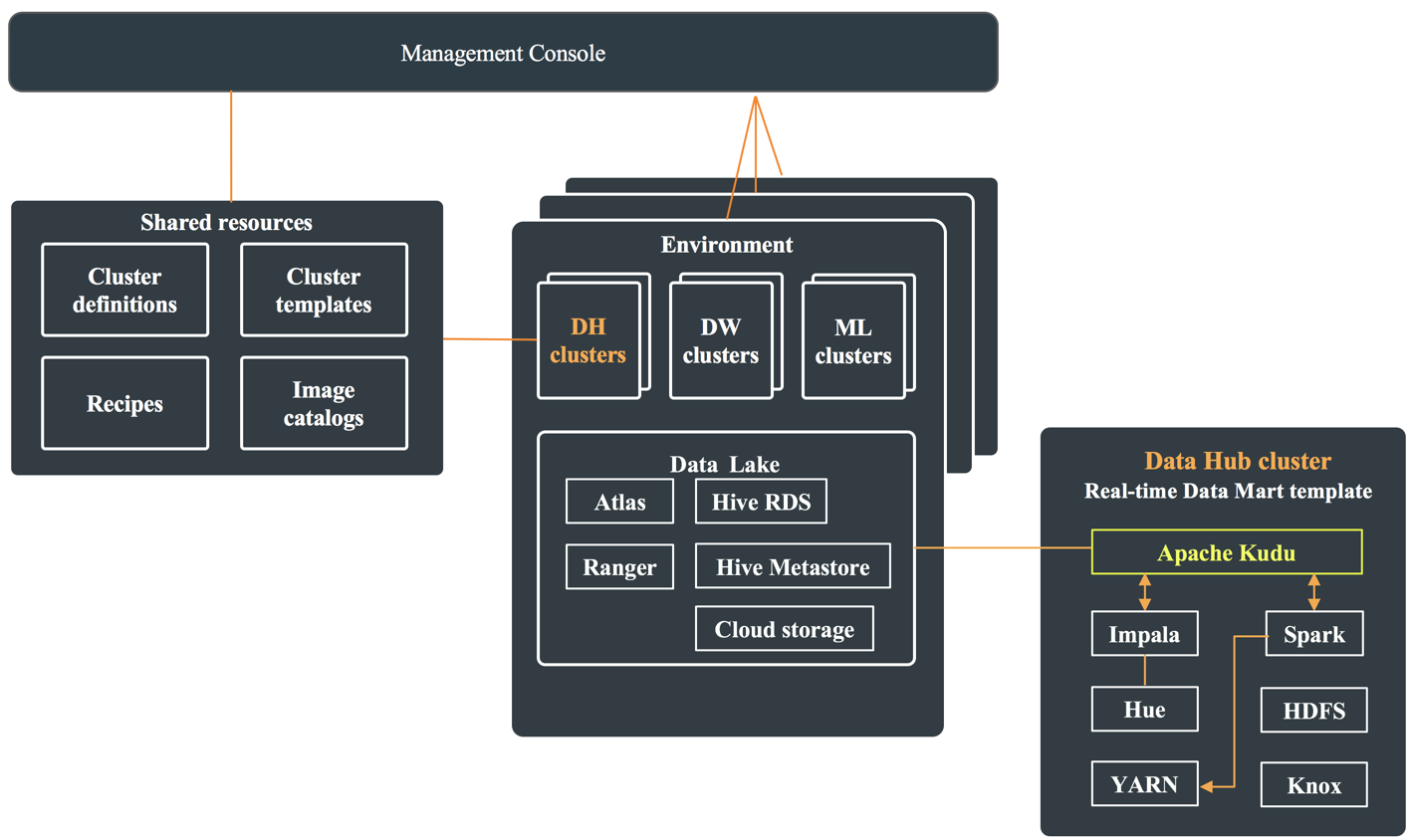 Each Data Hub cluster that is deployed using the Real-time Data Mart template has an instance of Apache Kudu, Impala, Spark, and Knox. It also contains YARN—which is used to run Spark, Hue—which can be used to issue queries using Impala, and HDFS—because the cluster is managed using Cloudera Manager. These components use the shared resources present within the Data Lake.