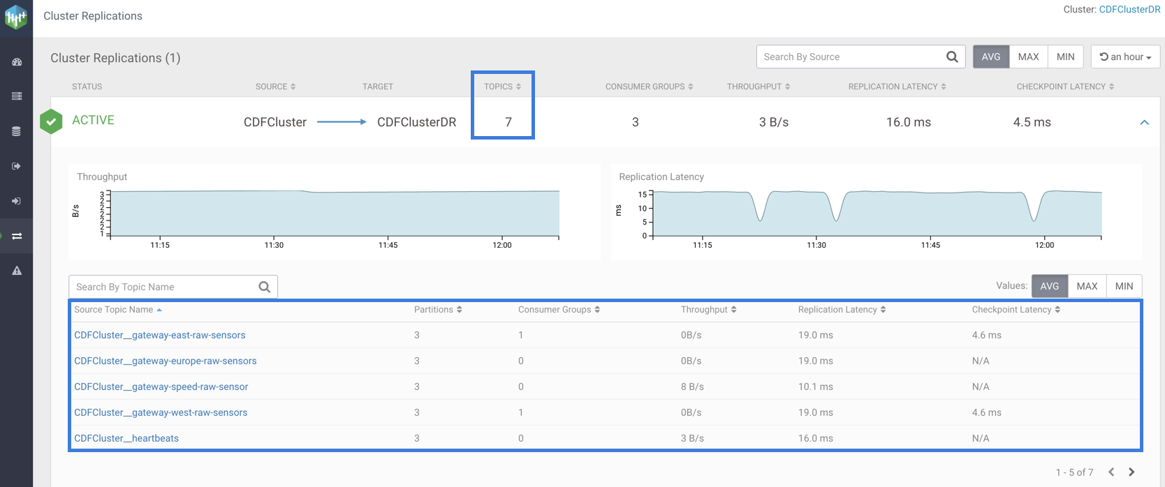 In the image, you can see that the number of topics to be replicated from CDFCluster to CDFClusterDR is 7, and topic details including topic names, number of partitions for the topics at the source cluster, number of consumer groups consuming messages from each topic, throughput, replication latency, and checkpoint latency of each topic.