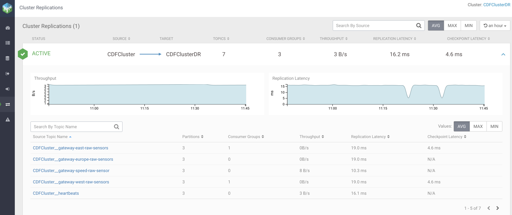You can view the status of the replications, source cluster names, target cluster names, number of topics to be replicated, number of consumer groups, throughput of the replication, replication latency, and checkpoint latency. SMM also displays two graphs, one represents the throughput of the replication and the other displays the replication latency of the replication along with the details of each topic to be replicated.