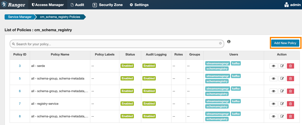 You can create a custom access policy for a specific Schema Registry entity, specify an access type, and add a user or user-group to the policy.