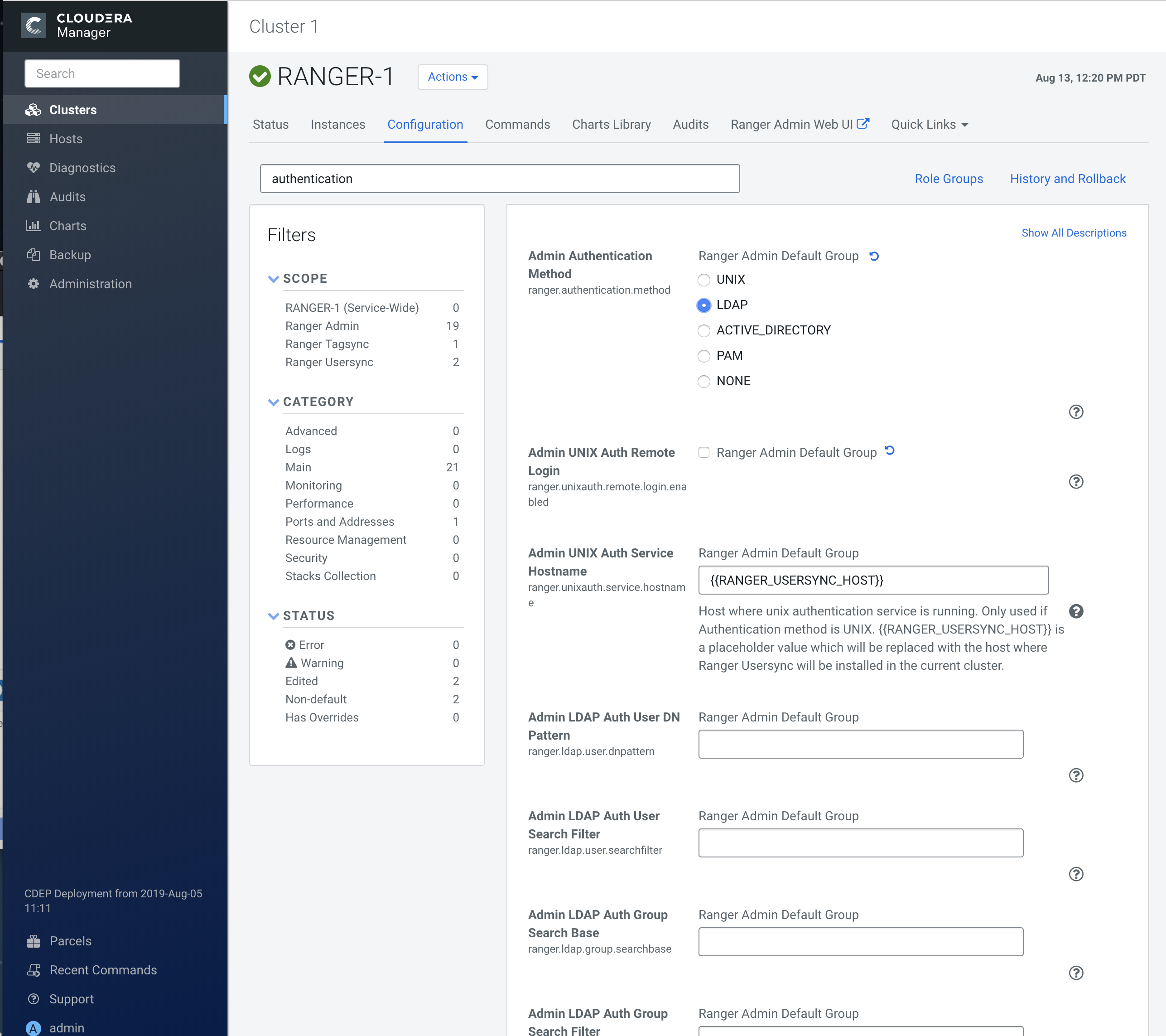 - In Cloudera Manager, select Ranger, then click the Configuration tab.
