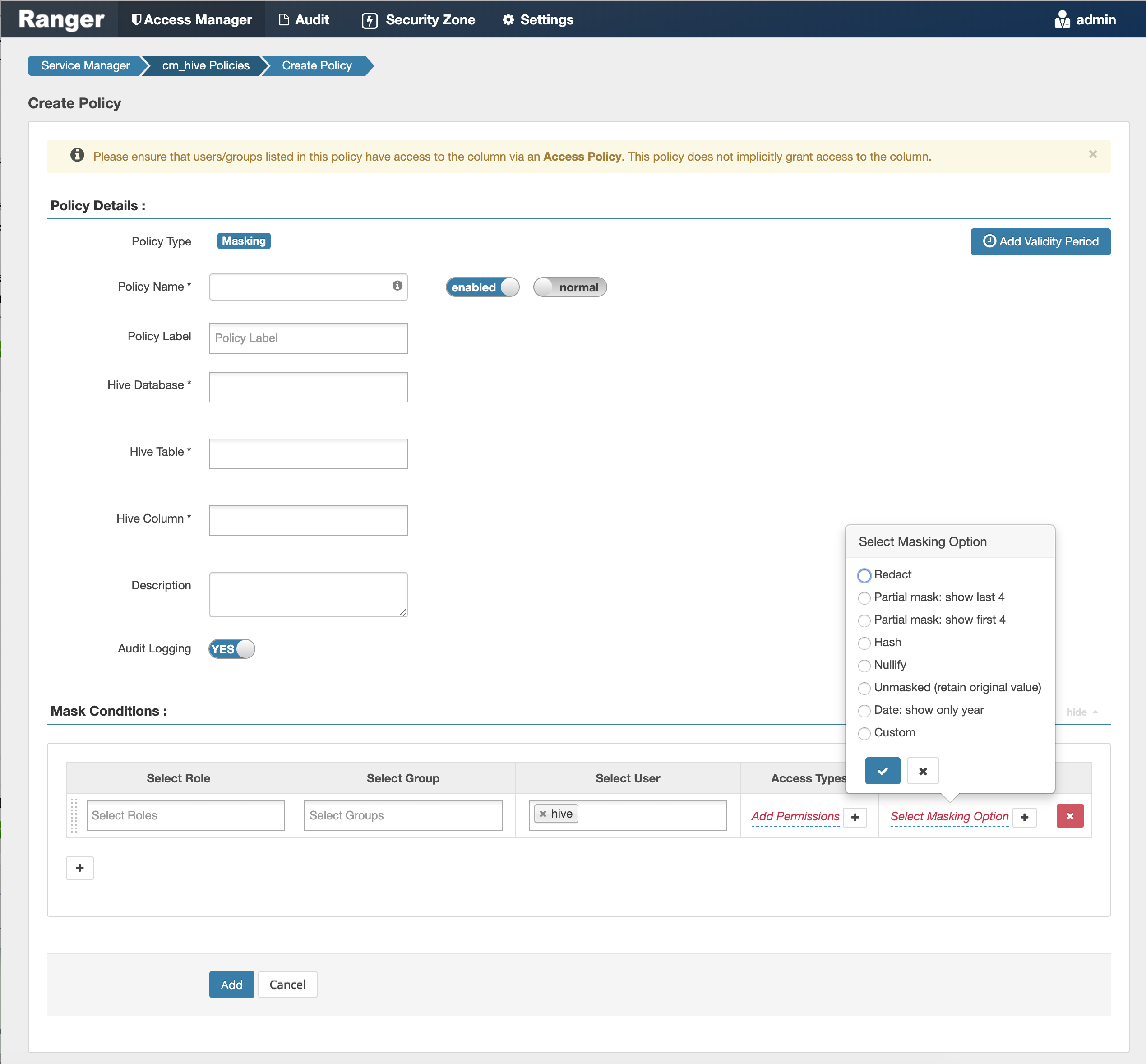 Dynamic column masking policies are similar to other Ranger access policies for Hive. You can set filters for specific users, groups, and conditions. With dynamic column-level masking, sensitive information never leaves Hive, and no changes are required at the consuming application or the Hive layer. There is also no need to produce additional protected duplicate versions of datasets.