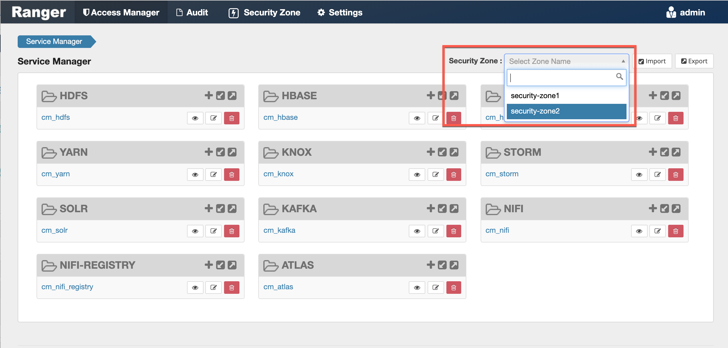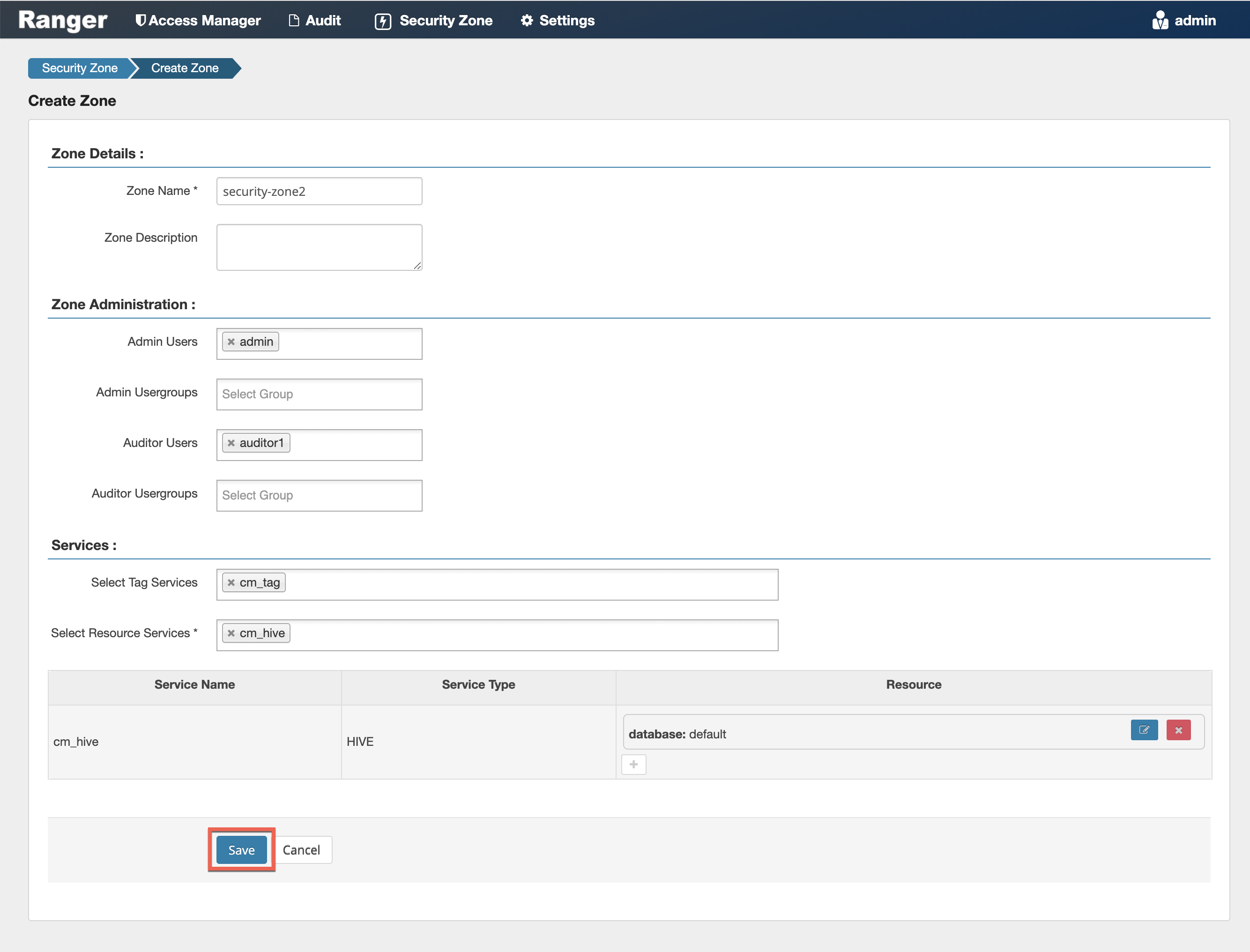 Table 1. Zone Details Field Description Zone Name The security zone name. Zone Description An optional description. Table 2. Zone Administration Field Description Admin Users The Admin users for the security zone. Admin Usergroups The Admin user groups for the security zone. Auditor Users The Auditor users for the security zone. Auditor Usergroups The Auditor user groups for the security zone. Table 3. Services Label