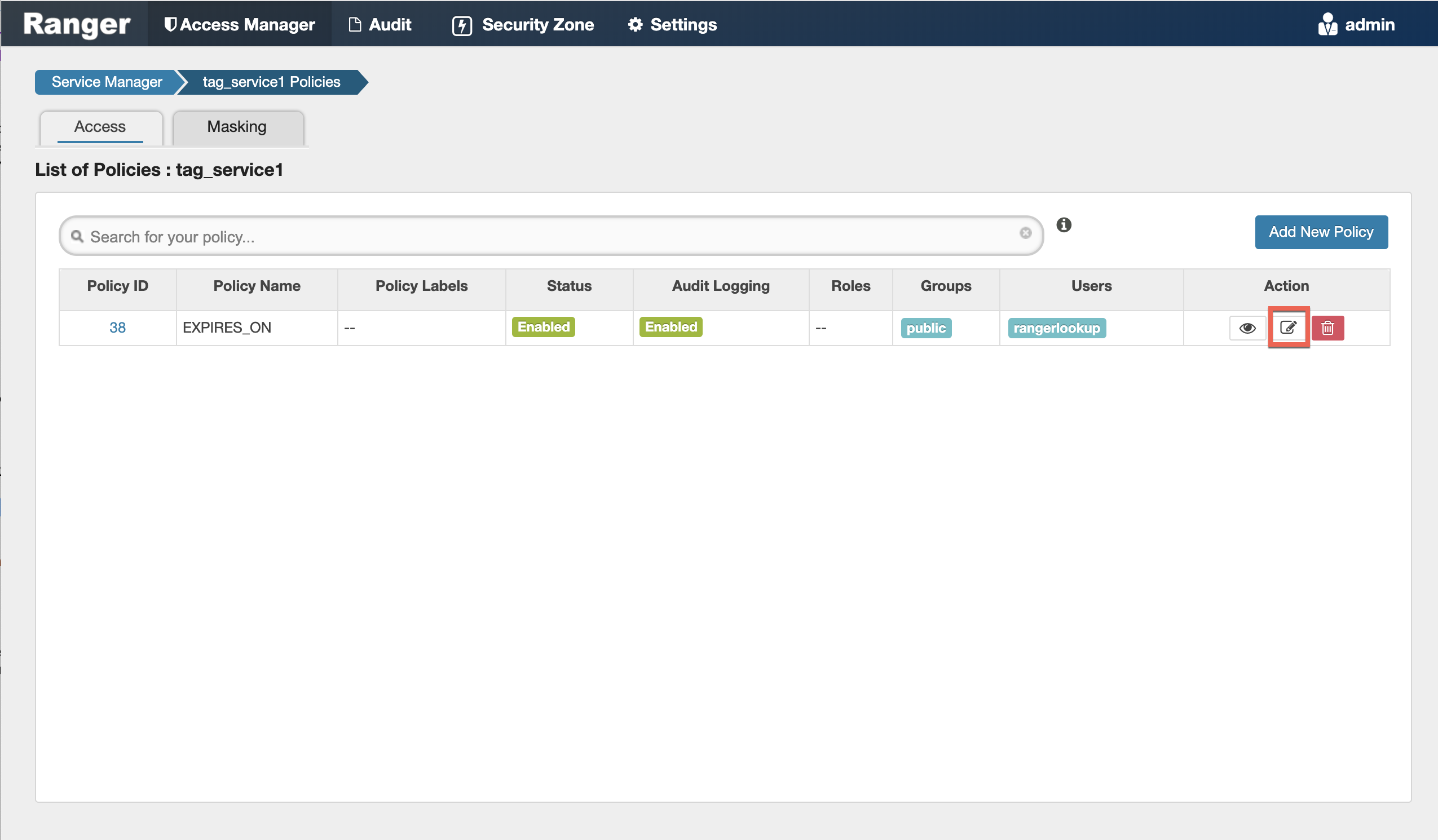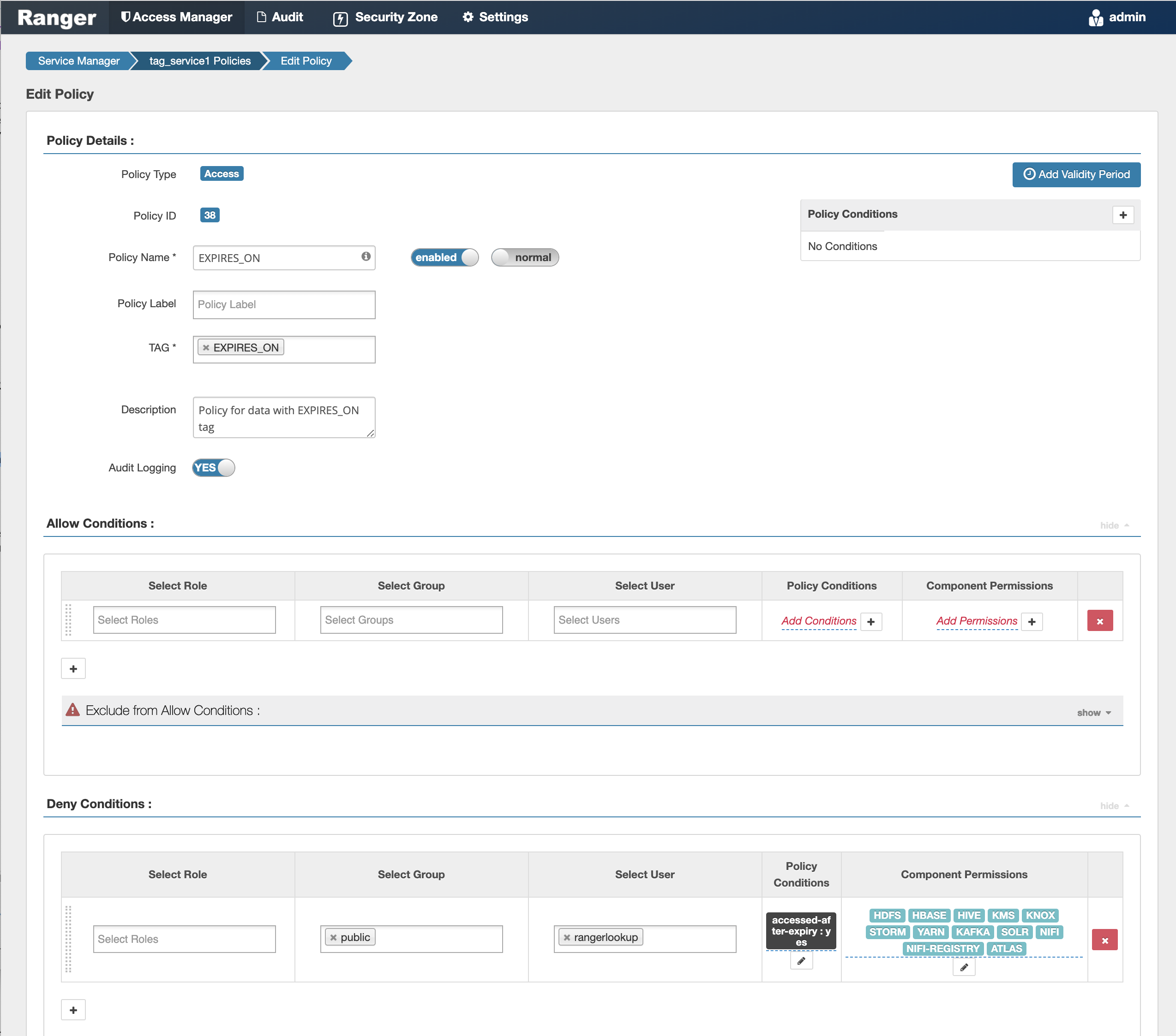 An EXPIRES_ON tag-based policy is created automatically when a tag service instance created. This default policy denies access to objects tagged with EXPIRES_ON after the expiry date specified in the Atlas tag attribute. You can use the following steps to review the default EXPIRES_ON policy.